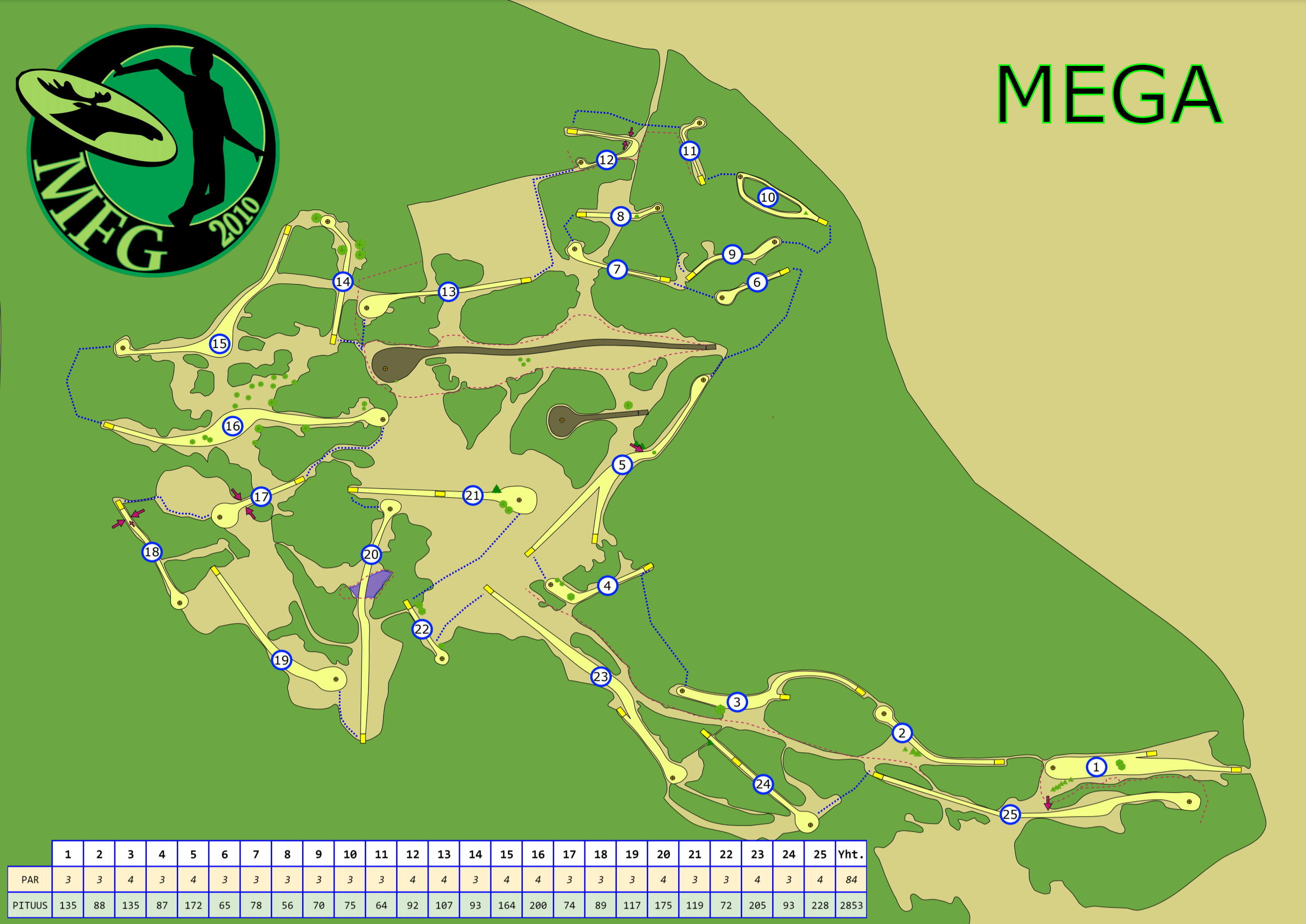 Megamäny layout. Pelataan järjestyksessä ProMäny väylät 1-5, Mörri väylät 6-13, ProMäny väylät 7-18. http://www.mantsalanfg.com/ratakartat/mega_iso.png