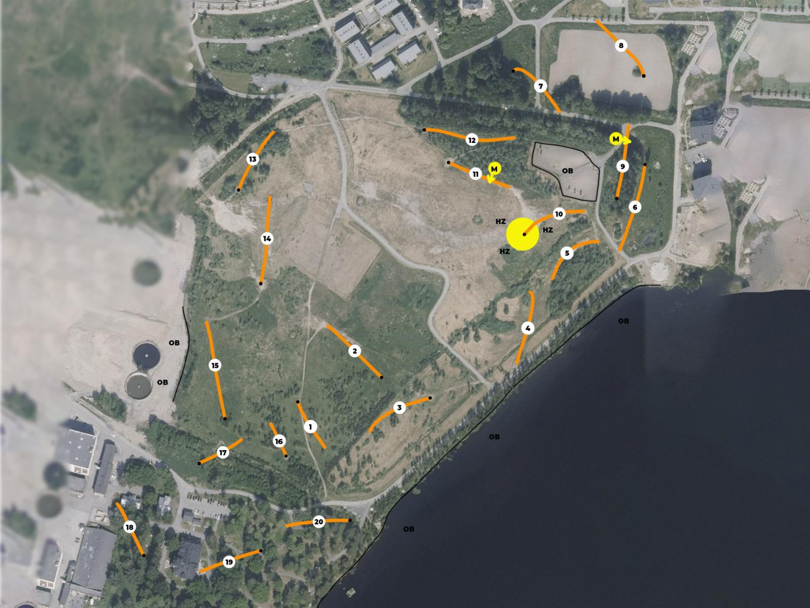 11# - 65m, Mando kierrettävä vasemmalta. Jos missataan niin jatko edelliseltä heittopaikalta (+1). Ei OB:ta paitsi järvi.