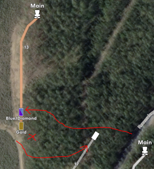 Tiedoksi viikkokisailijoille, että Gold #11 -tiin takaoikealla on haljennut puu, jota pitää varoa (jos ei ole vielä kaatunut / kaadettu kaupungin toimesta). Puun kohta on merkitty rastilla oheiseen kuvaan. Eli kulkekaa siis Blue #13 -väylälle väistämällä metsän kautta. Samoin Blue #17 -väylälle kulkiessa on kierrettävä ko. kohta.