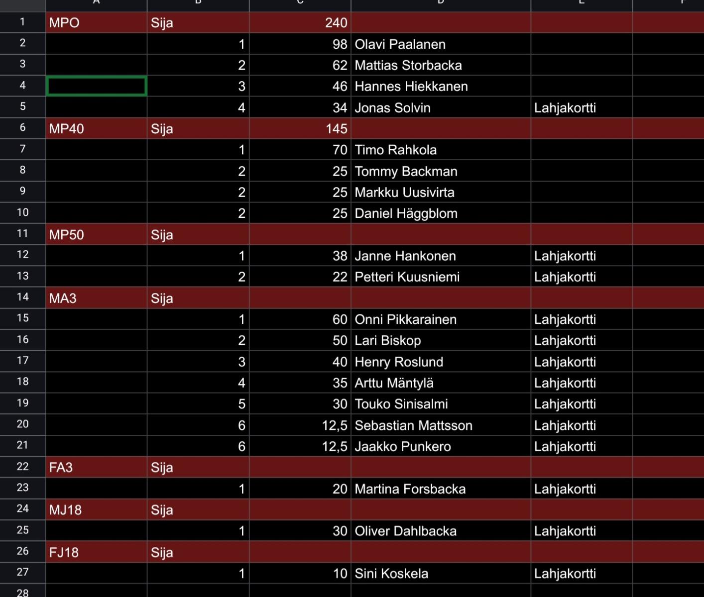 Sarjat: MPO, FPO, MP40, FP40, MP50, FP50, MJ18, FJ18, MA3, FA3