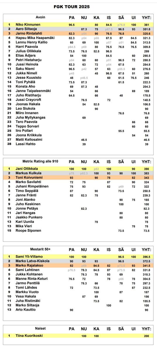Kaikille avoin FGK Tour 2025 pelataan seuraavilla radoilla: