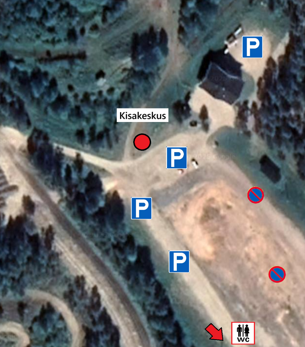 Pyssymäen radalla pysäköinti tapahtuu kuvan mukaisesti kisakeskuksen edustalle tai Pyssyhovin (punainen suuri talo) taakse. WC-tilat löytyvät kartan mukaisesti 17- ja 18-väylän läheisyydessä olevasta rakennuksesta.