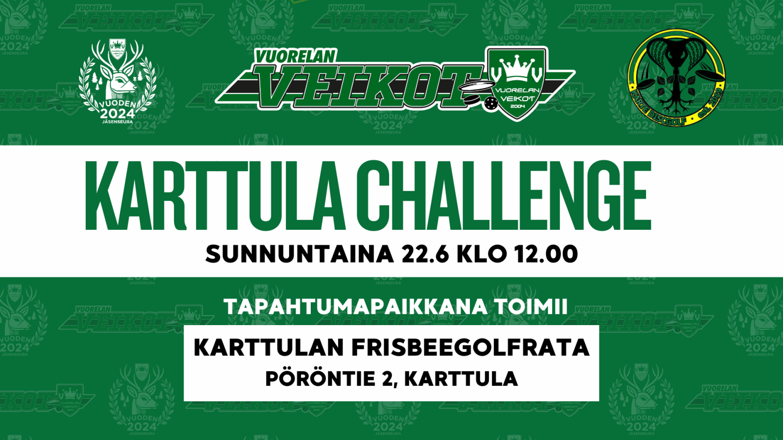 Vuorelan Veikkojen järjestämä kaikille avoin ja ilmainen kilpailu Karttulan frisbeegolfradalla pelataan sunnuntaina 22.6.2025 klo 12.00 alkaen.