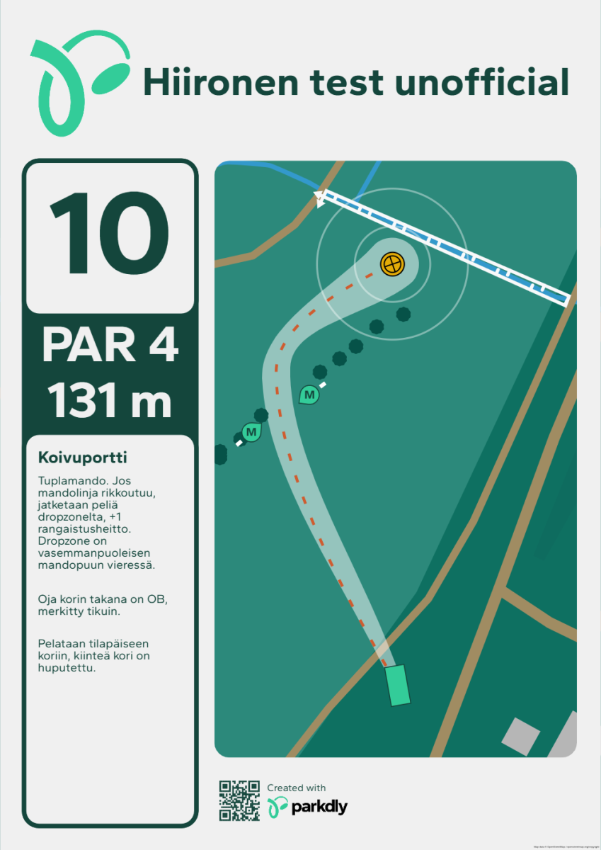 Väylä 10: Koivuportti -väylä, 131m PAR 4. Tuplamando ja koripaikka siirretty (kiinteä kori huputettu). OB-linja (oja) merkitty valkoisin tikuin.
