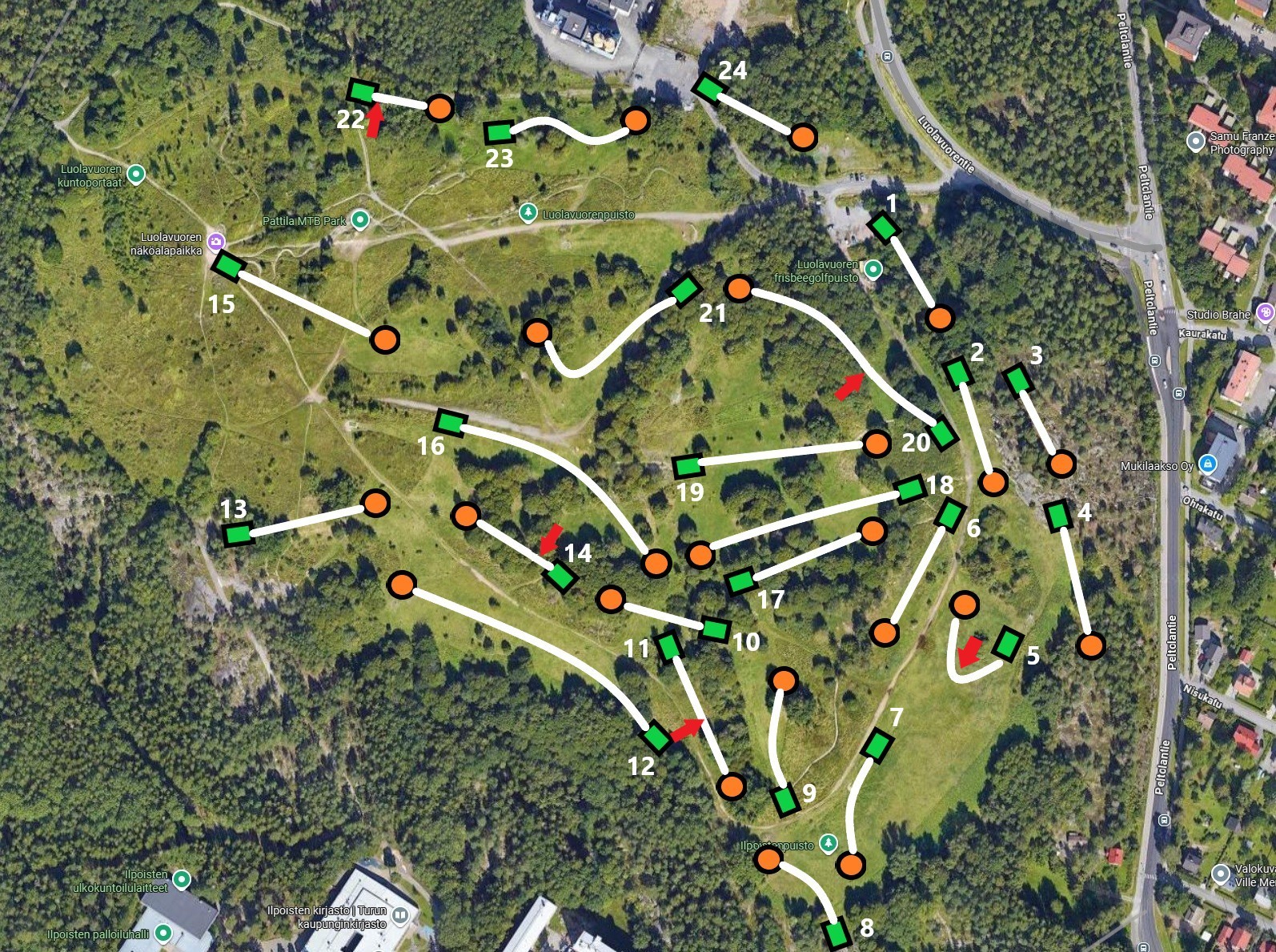 HUOM! Väylällä myös ERIKOISSÄÄNTÖ! Jos osut väylällä oleviin puihin, niiden tukikeppeihin tai suojaverkkoon, merkitään sinulle rangaistusheitto. Jos kiekko jää puun, keppien tai suojaverkon juureen, saat ottaa metrin casual reliefin.