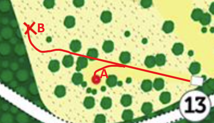 Pelataan 13b väylä (punaisella merkitty kuvassa), 174m, Par 4.
