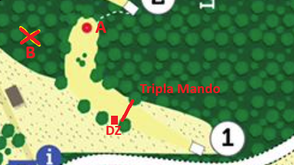 Pelataan 1b (keltaisella merkitty kuvassa) - 135m, par 4, triplamando sekä droppari pelissä.