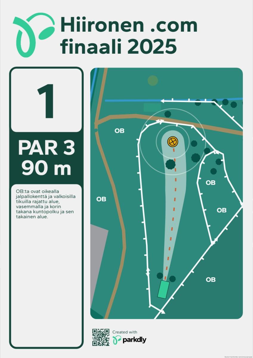 Väylä #1: OB:ta oikealla jalkapallokenttä ja valkoisin tikuin merkitty alue. Korin takana OB:ta kuntopolku ja sen takainen alue. Vasemmalla OB merkitty valkoisin tikuin.