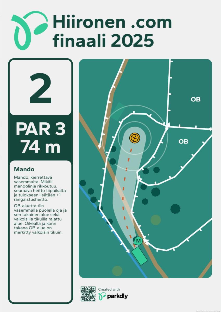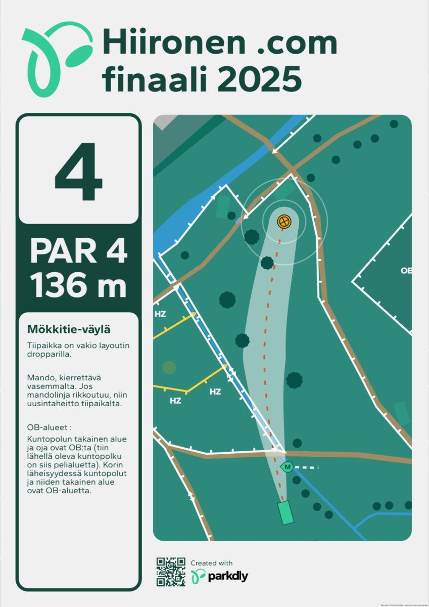 Väylä 4, Mökkitie: Par 4, Tiipaikka on vakioväylän dropparilla. Mando oikealla, kierrettävä vasemmalta. OB:ta edessä vasemmalla kuntopolun takainen alue (kuntopolku siis IB), sekä oja. Korin oikealla puolella ja takana kuntopolut ja niiden takainen alue on OB.