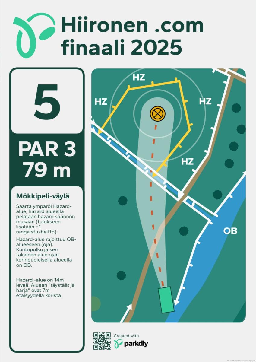 Kori sijaitsee hazard-alueen sisällä olevassa saaressa. Hazard alue on n. 14m leveä, mökin muotoisen saaren harja on n. 7m etäisyydellä korista. Alue rajoittuu OB-ojaan.