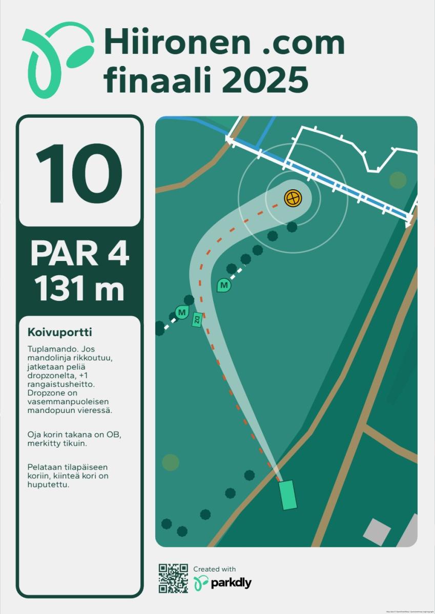 Väylä 10, Koivuportti: Par 4, tuplamando, drop zone vasemman mandopuun läheisyydessä. Pelataan irtokoriin, vakiokori huputettu. OB:ta oja korin takana (Merkitty tikuin) sekä vasemmalla kuntopolku ja sen takainen alue.