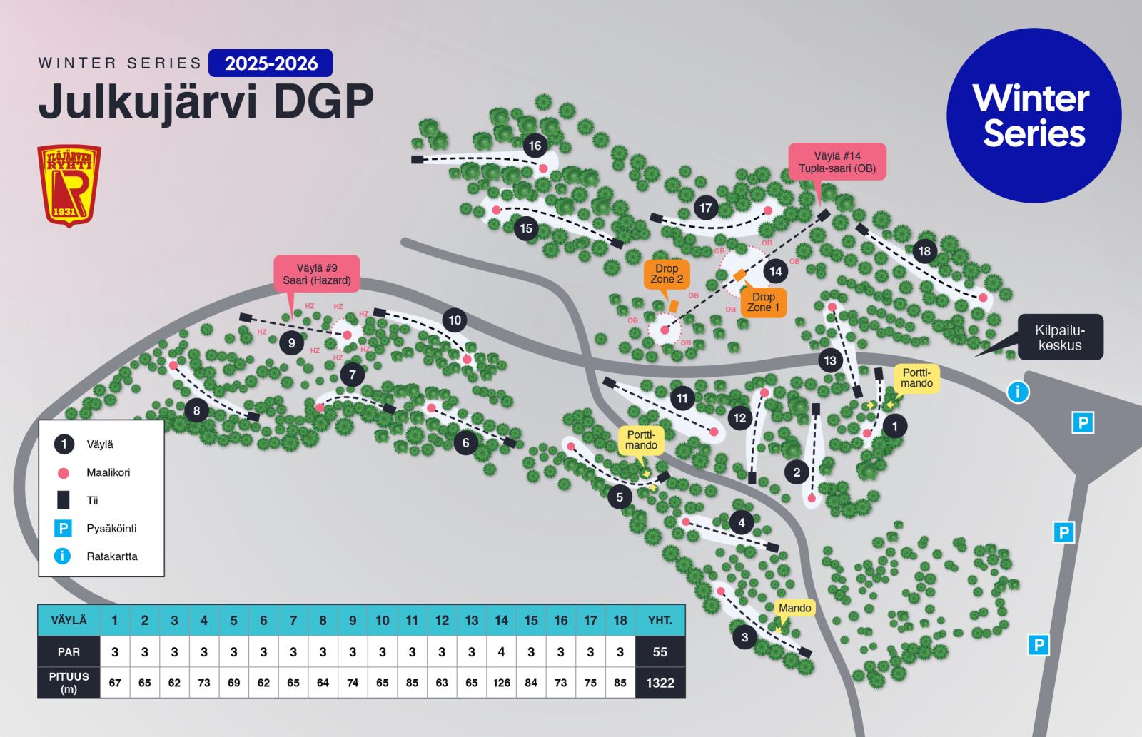 Pelataan kaksi kierrosta Julkujärvelle kilpailu varten rakennettavaa 18-väyläistä WS-leiskaa.